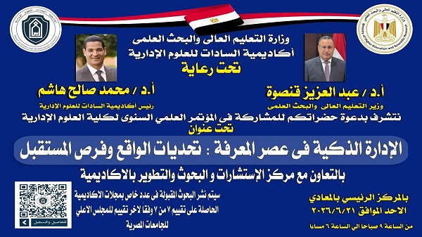 تحت رعاية وزير التعليم العالي والبحث العلمي، الأستاذ الدكتور عبد العزيز قنصوة، ورئيس أكاديمية السادات للعلوم الإدارية الأستاذ الدكتور محمد صالح هاشم، أعلنت أكاديمية السادات عن تنظيم مؤتمرها العلمي السنوي لكلية العلوم الإدارية، في خطوة تعكس توجهًا استراتيجيًا نحو تعزيز دور الإدارة الذكية في مواجهة تحديات العصر.